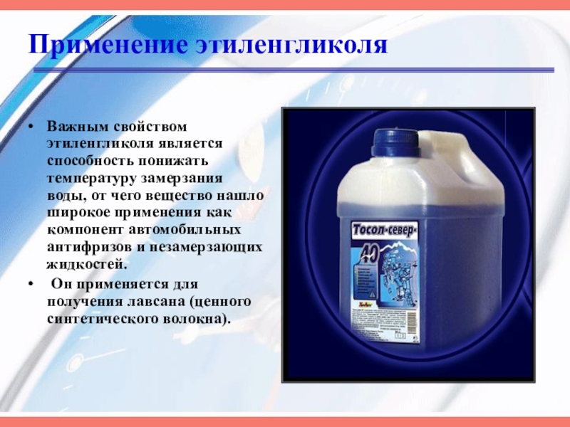 Применение этиленгликоляВажным свойством этиленгликоля является способность понижать температуру замерзания воды, от чего вещество нашло широкое применения как