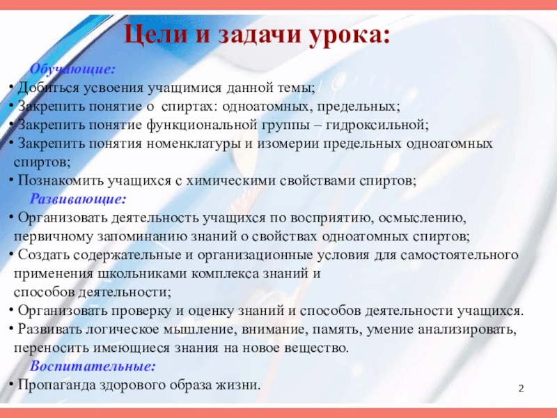 Цели и задачи урока: Обучающие: Добиться усвоения учащимися данной темы; Закрепить понятие о  спиртах: одноатомных, предельных; Закрепить понятие функциональной группы – гидроксильной; Закрепить понятия номенклатуры и изомерии предельных одноатомных спиртов; Познакомить учащихся с химическими свойствами
