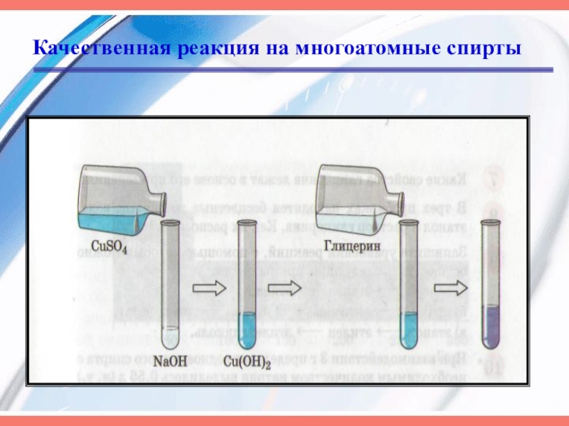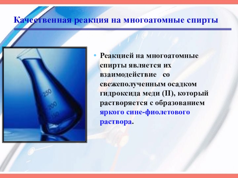 Качественная реакция на многоатомные спиртыРеакцией на многоатомные спирты является их взаимодействие  со  свежеполученным осадком гидроксида