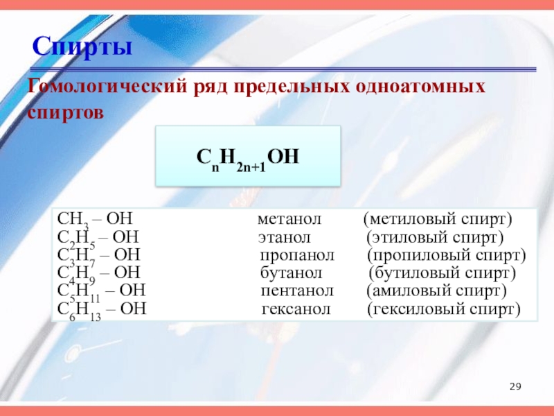 Слайд 29Гомологический ряд предельных одноатомных спиртов