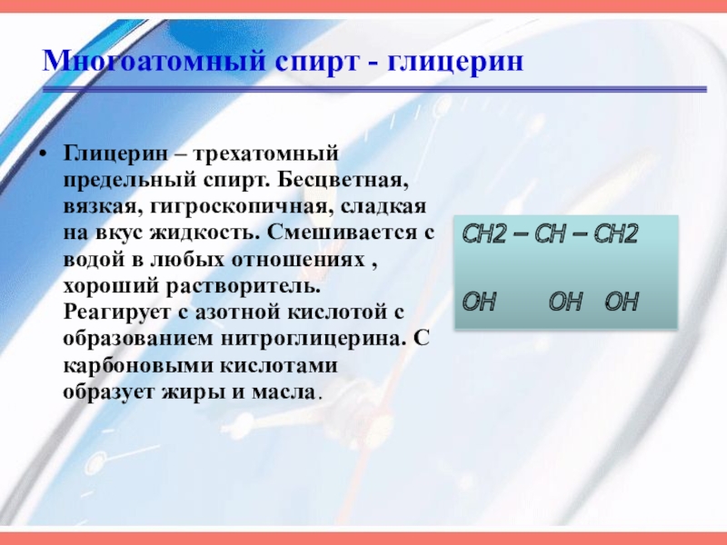 Многоатомный спирт - глицеринГлицерин – трехатомный предельный спирт. Бесцветная, вязкая, гигроскопичная, сладкая на вкус жидкость. Смешивается с