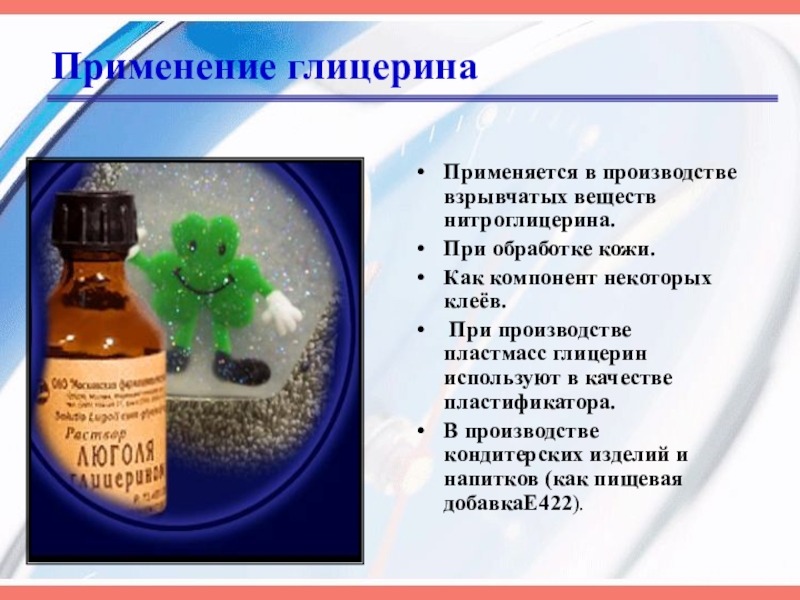 Применение глицеринаПрименяется в производстве взрывчатых веществ нитроглицерина.При обработке кожи. Как компонент некоторых клеёв. При производстве пластмасс глицерин