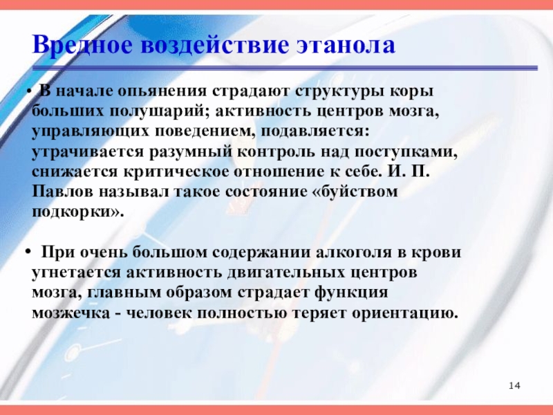 Вредное воздействие этанола В начале опьянения страдают структуры коры больших полушарий; активность центров мозга, управляющих поведением, подавляется: