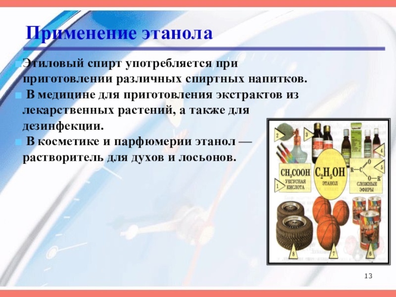 Применение этанолаЭтиловый спирт употребляется при приготовлении различных спиртных напитков. В медицине для приготовления экстрактов из лекарственных растений,