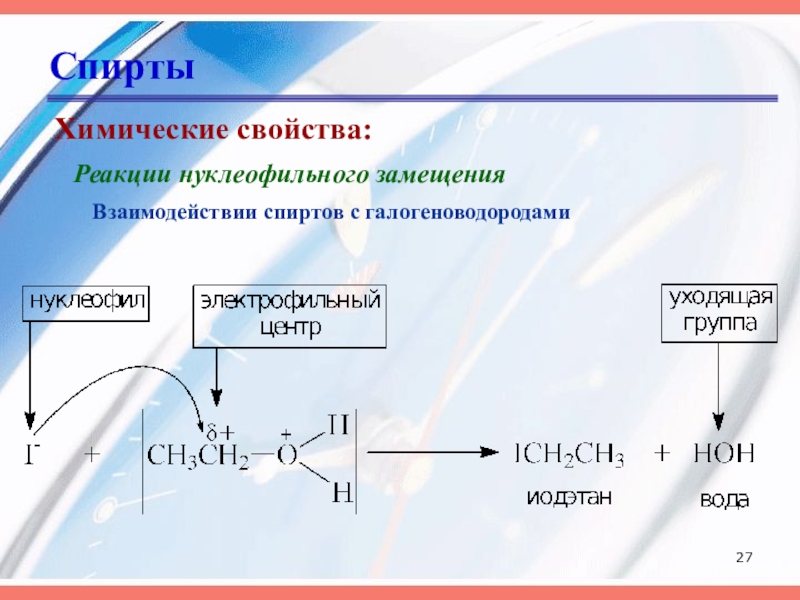 СпиртыХимические свойства:Реакции нуклеофильного замещения Взаимодействии спиртов с галогеноводородами