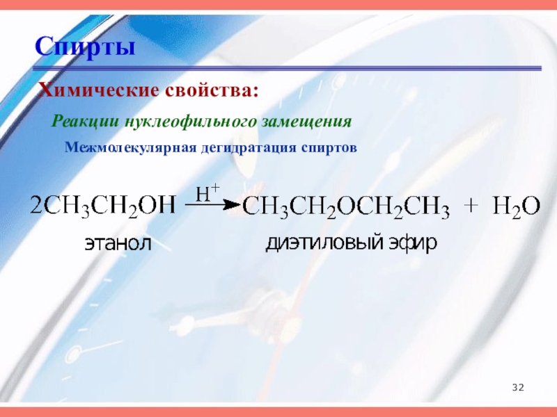 СпиртыХимические свойства:Реакции нуклеофильного замещения Межмолекулярная дегидратация спиртов