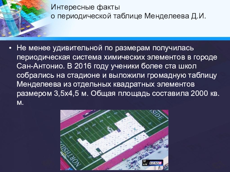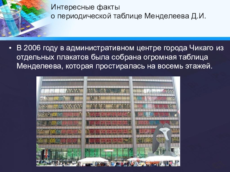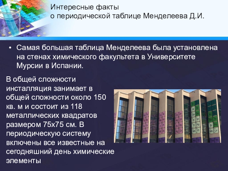 В общей сложности инсталляция занимает в общей сложности около 150 кв. м и состоит из 118 металлических квадратов размером 75х75 см. В периодическую систему включены все известные на сегодняшний день химические элементы