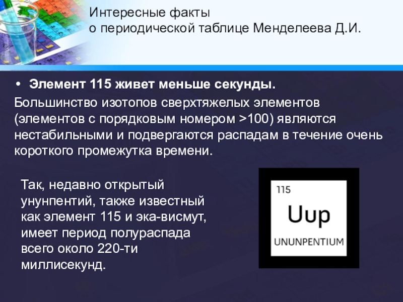 Так, недавно открытый унунпентий, также известный как элемент 115 и эка-висмут, имеет период полураспада всего около 220-ти миллисекунд.