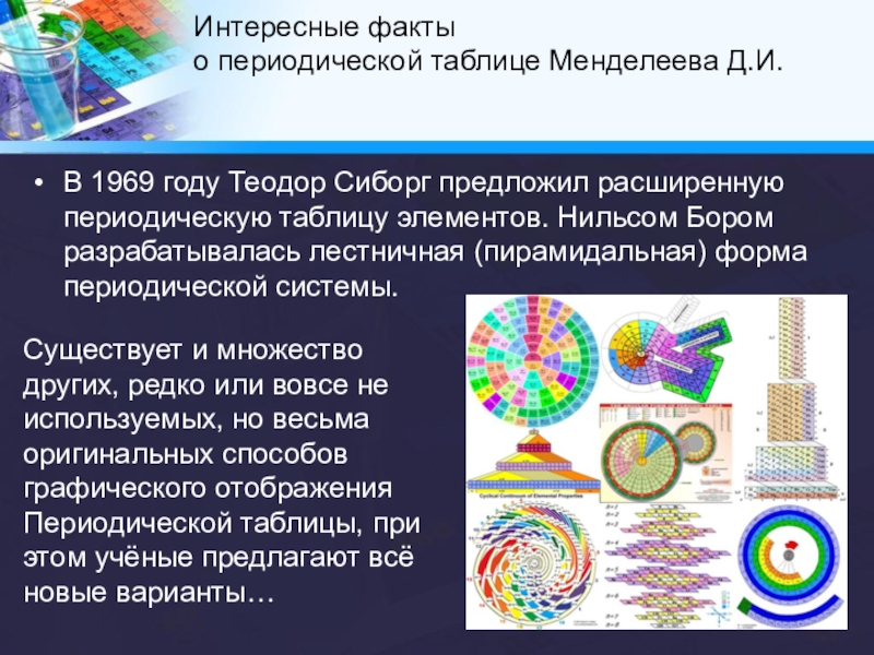 Существует и множество других, редко или вовсе не используемых, но весьма оригинальных способов графического отображения Периодической таблицы, при этом учёные предлагают всё новые варианты…