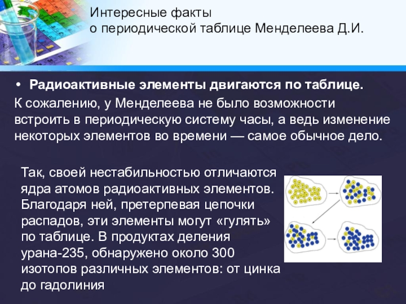 Так, своей нестабильностью отличаются ядра атомов радиоактивных элементов. Благодаря ней, претерпевая цепочки распадов, эти элементы могут «гулять» по таблице. В продуктах деления урана-235, обнаружено около 300 изотопов различных элементов: от цинка до гадолиния