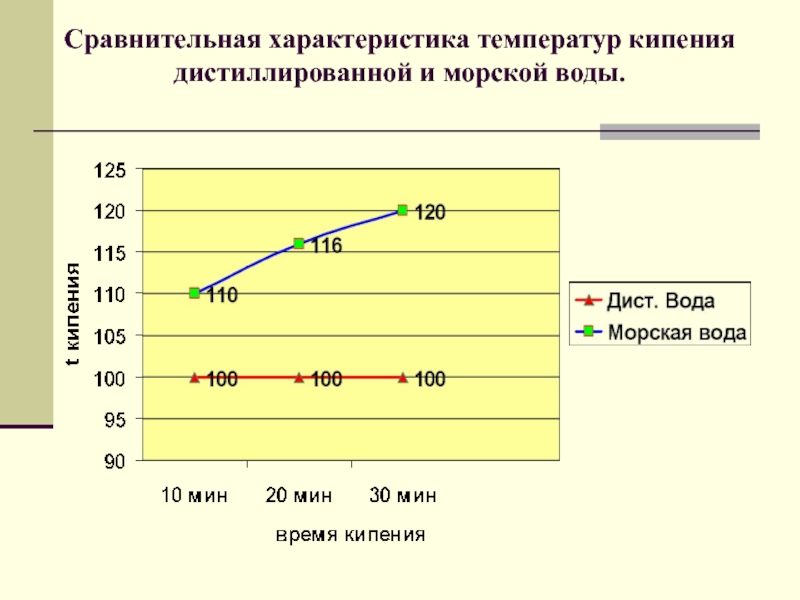 Слайд 8Сравнительная характеристика температур кипения дистиллированной и морской воды.