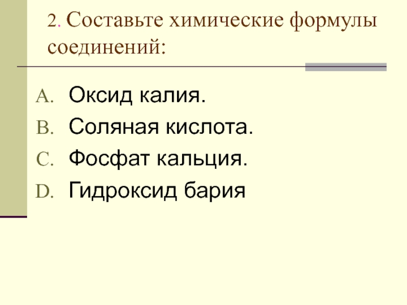 2. Составьте химические формулы соединений: Оксид калия.Соляная кислота.Фосфат кальция.Гидроксид бария
