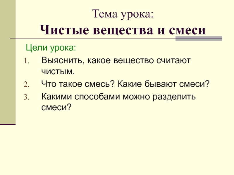 Тема урока: Чистые вещества и смесиЦели урока:Выяснить, какое вещество считают чистым. Что такое смесь? Какие бывают смеси?Какими