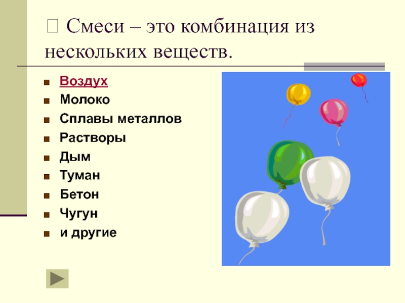? Смеси – это комбинация из нескольких веществ.ВоздухМолокоСплавы металловРастворыДымТуманБетонЧугуни другие