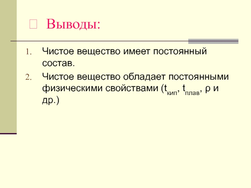 ? Выводы:Чистое вещество имеет постоянный состав.Чистое вещество обладает постоянными физическими свойствами (tкип, tплав, ρ и др.)