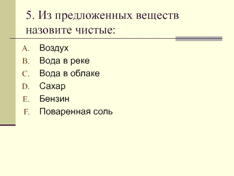 5. Из предложенных веществ назовите чистые:ВоздухВода в рекеВода в облакеСахарБензинПоваренная соль