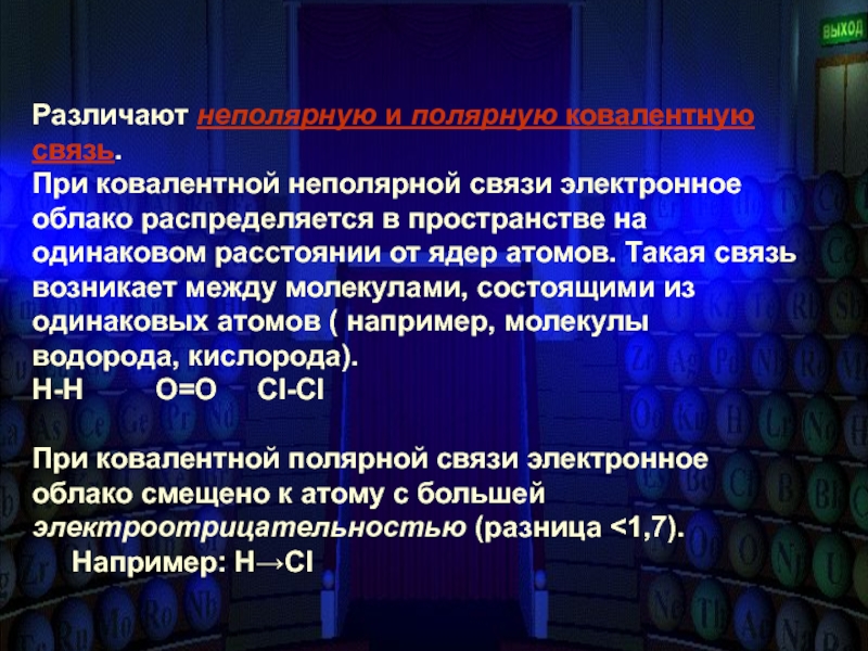 При ковалентной неполярной связи электронное облако распределяется в пространстве на одинаковом расстоянии от ядер атомов. Такая связь возникает между молекулами, состоящими из одинаковых атомов ( например, молекулы водорода, кислорода).