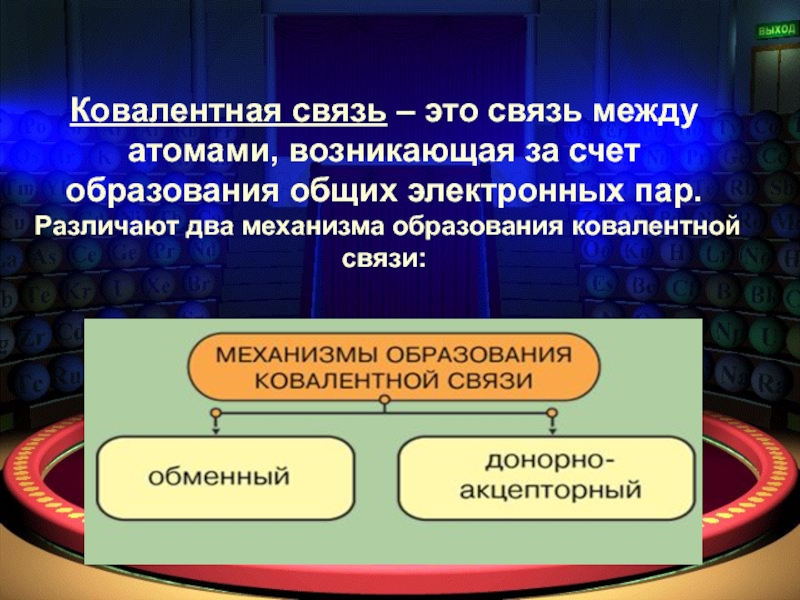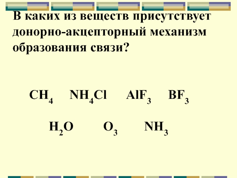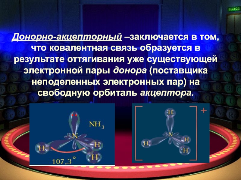Донорно-акцепторный –заключается в том, что ковалентная связь образуется в результате оттягивания уже существующей электронной пары донора (поставщика неподеленных электронных пар) на свободную орбиталь акцептора.