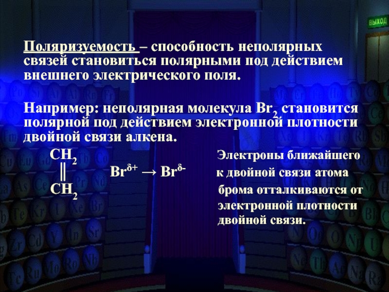 Например: неполярная молекула Br2 становится полярной под действием электронной плотности двойной связи алкена.
