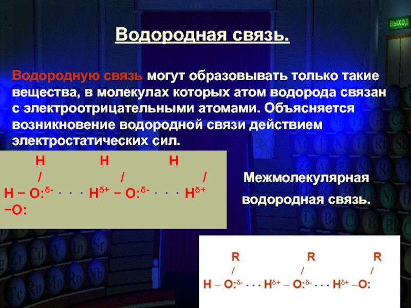 Водородную связь могут образовывать только такие вещества, в молекулах которых атом водорода связан с электроотрицательными атомами. Объясняется возникновение водородной связи действием электростатических сил.