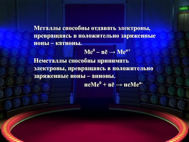Металлы способны отдавать электроны, превращаясь в положительно заряженные ионы – катионы.