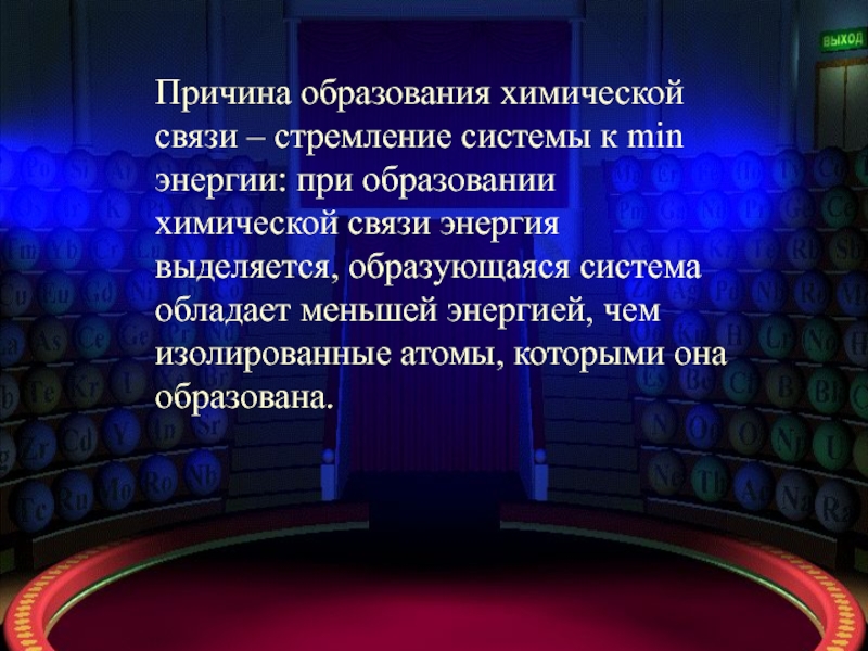 Причина образования химической связи – стремление системы к min энергии: при образовании химической связи энергия выделяется, образующаяся система обладает меньшей энергией, чем изолированные атомы, которыми она образована.