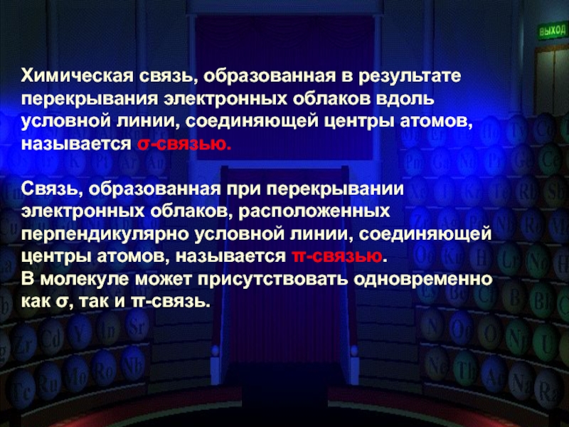 Химическая связь, образованная в результате перекрывания электронных облаков вдоль условной линии, соединяющей центры атомов, называется σ-связью.