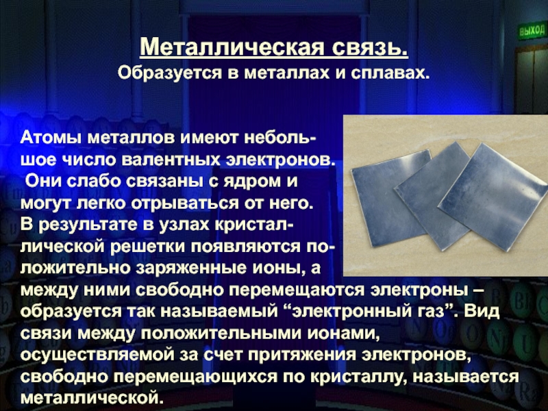 между ними свободно перемещаются электроны – образуется так называемый “электронный газ”. Вид связи между положительными ионами, осуществляемой за счет притяжения электронов, свободно перемещающихся по кристаллу, называется металлической.