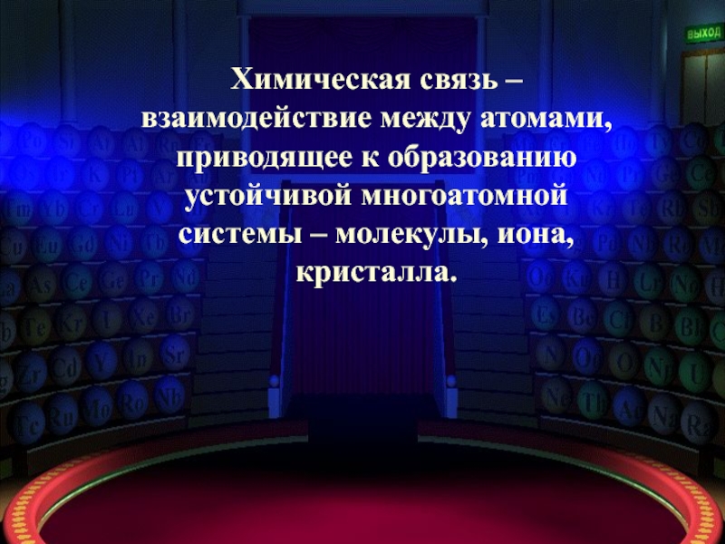 Химическая связь – взаимодействие между атомами, приводящее к образованию устойчивой многоатомной системы – молекулы, иона, кристалла.