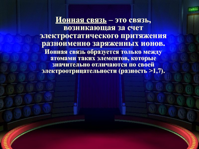 Ионная связь образуется только между атомами таких элементов, которые значительно отличаются по своей электроотрицательности (разность >1,7).