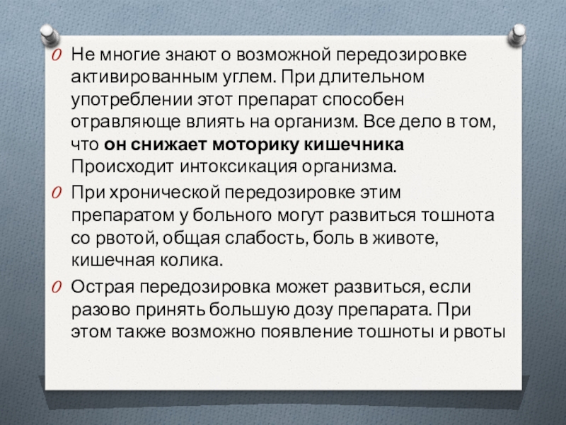 Слайд 11Не многие знают о возможной передозировке активированным углем. При длительном употреблении