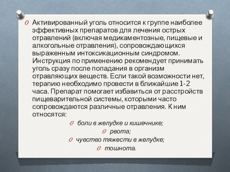 отравлений (включая медикаментозные, пищевые и алкогольные отравления), сопровождающихся выраженным интоксикационным синдромом. Инструкция по применению рекомендует принимать уголь сразу после попадания в организм отравляющих веществ. Если такой возможности нет, терапию необходимо провести в ближайшие 1-2 часа. Препарат помогает избавиться от расстройств пищеварительной системы, которыми часто сопровождаются различные отравления. К ним относятся: