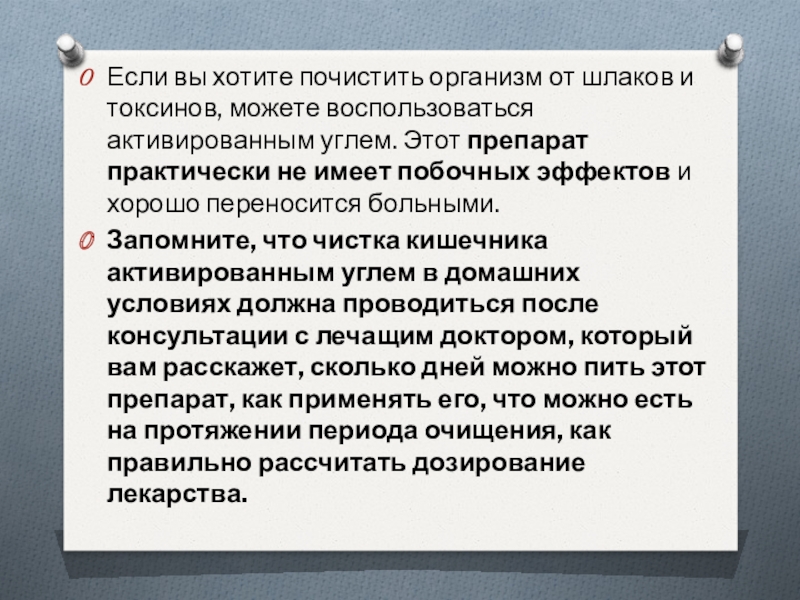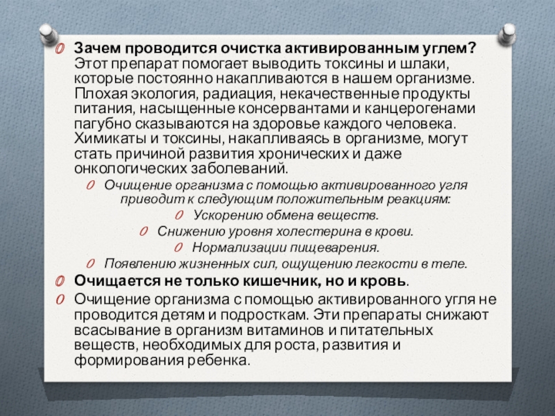 Слайд 10Зачем проводится очистка активированным углем? Этот препарат помогает выводить токсины и