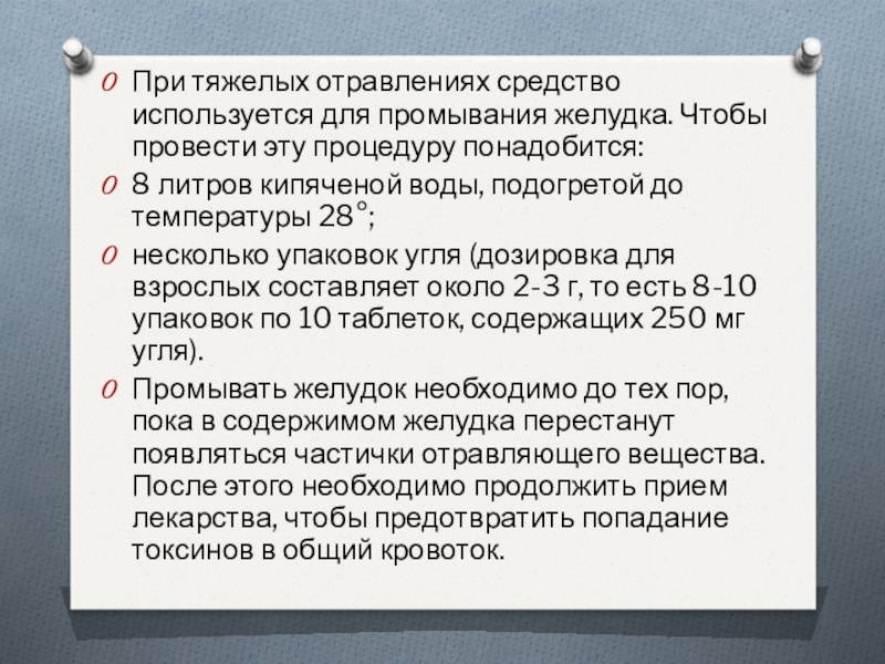 Слайд 8При тяжелых отравлениях средство используется для промывания желудка. Чтобы провести эту