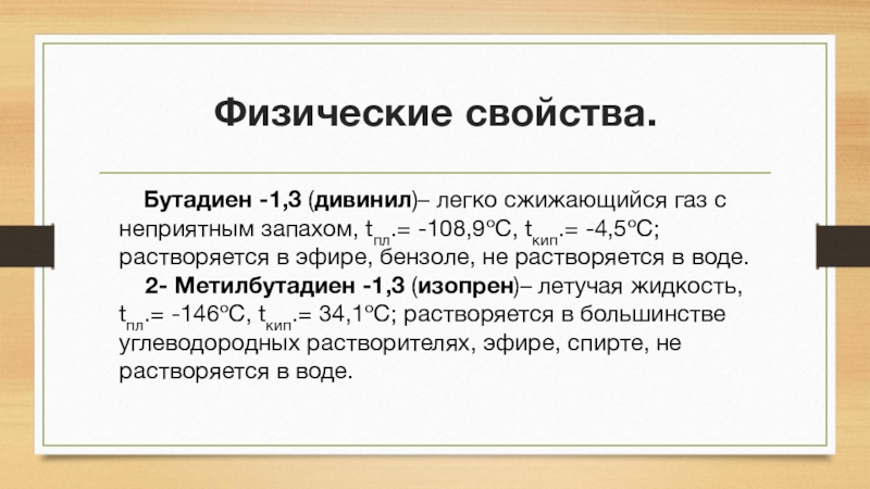 Физические свойства.     Бутадиен -1,3 (дивинил)– легко сжижающийся газ с неприятным запахом, tпл.= -108,9ºC,