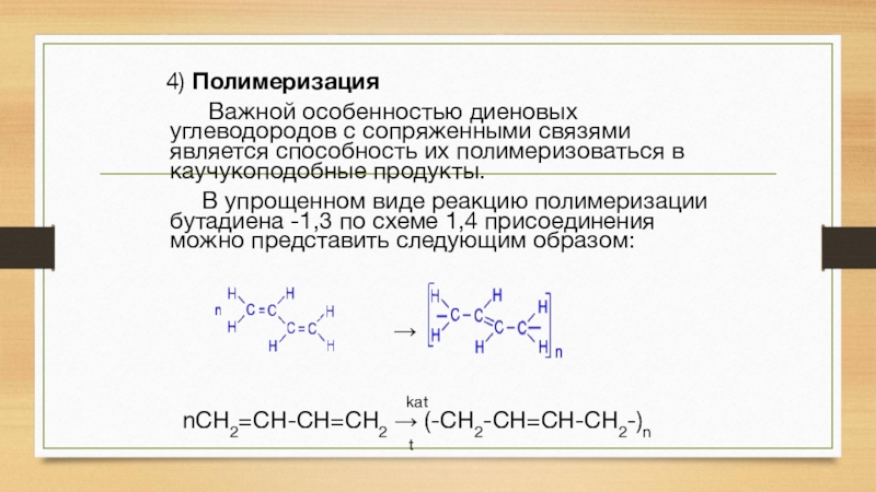 4) Полимеризация     Важной особенностью диеновых углеводородов с сопряженными связями является способность