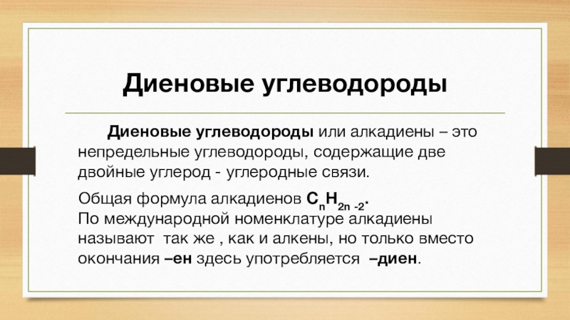 Диеновые углеводороды Диеновые углеводороды или алкадиены – это непредельные углеводороды, содержащие две двойные углерод - углеродные связи. Общая формула алкадиенов CnH2n -2. По международной номенклатуре алкадиены называют так же , как и алкены, но