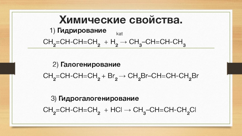 Химические свойства.   1) Гидрирование   kat CH2=CH-CH=CH2 + H2 → CH3–СH=CH-CH3