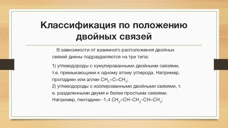 Классификация по положению двойных связей    В зависимости от взаимного расположения двойных связей диены подразделяются