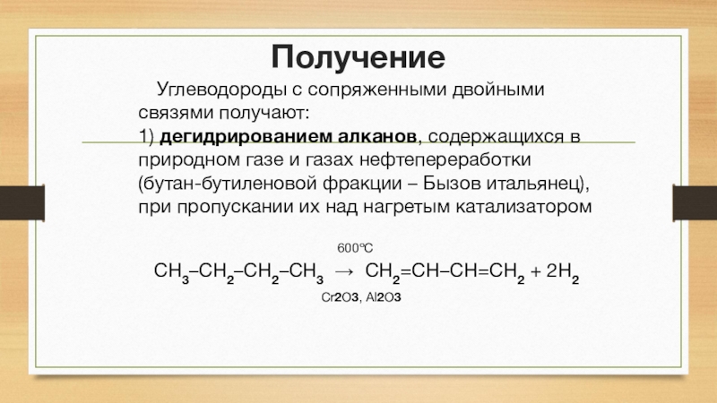 Получение     Углеводороды с сопряженными двойными связями получают: 1) дегидрированием алканов, содержащихся в природном газе