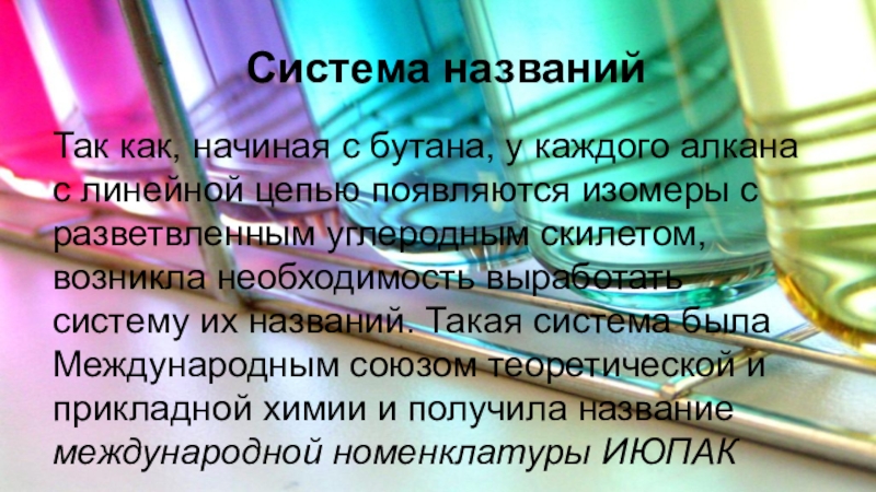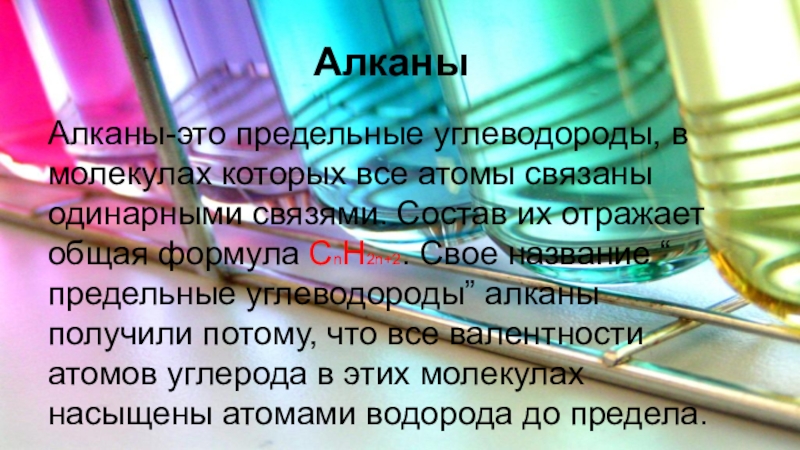 Алканы-это предельные углеводороды, в молекулах которых все атомы связаны одинарными связями. Состав их отражает общая формула CnH2n+2. Свое название “ предельные углеводороды” алканы получили потому, что все валентности атомов углерода в этих молекулах насыщены атомами водорода до предела.