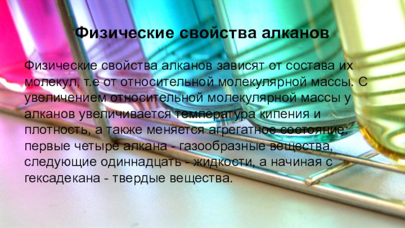 Физические свойства алканов зависят от состава их молекул, т.е от относительной молекулярной массы. С увеличением относительной молекулярной массы у алканов увеличивается температура кипения и плотность, а также меняется агрегатное состояние: первые четыре алкана - газообразные вещества, следующие одиннадцать - жидкости, а начиная с гексадекана - твердые вещества.