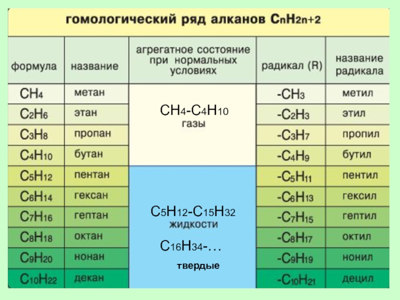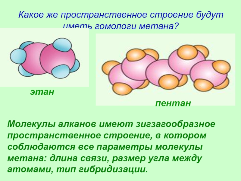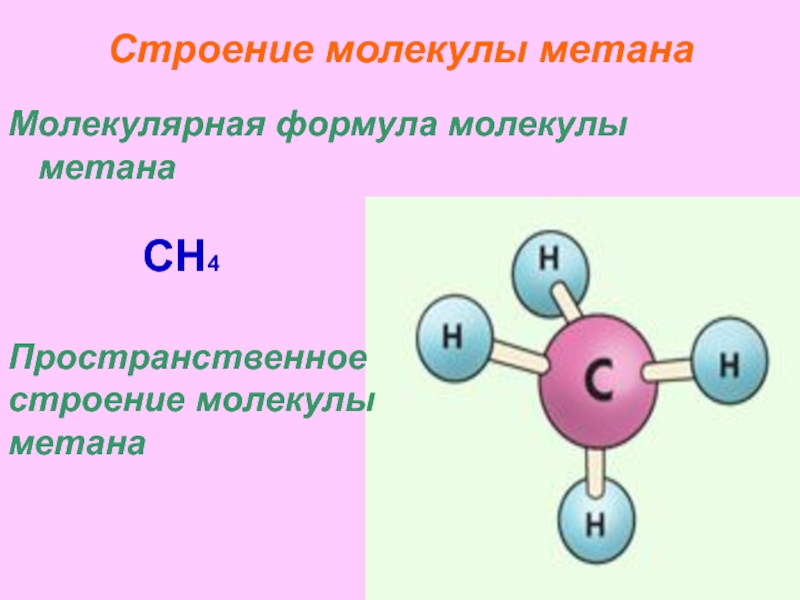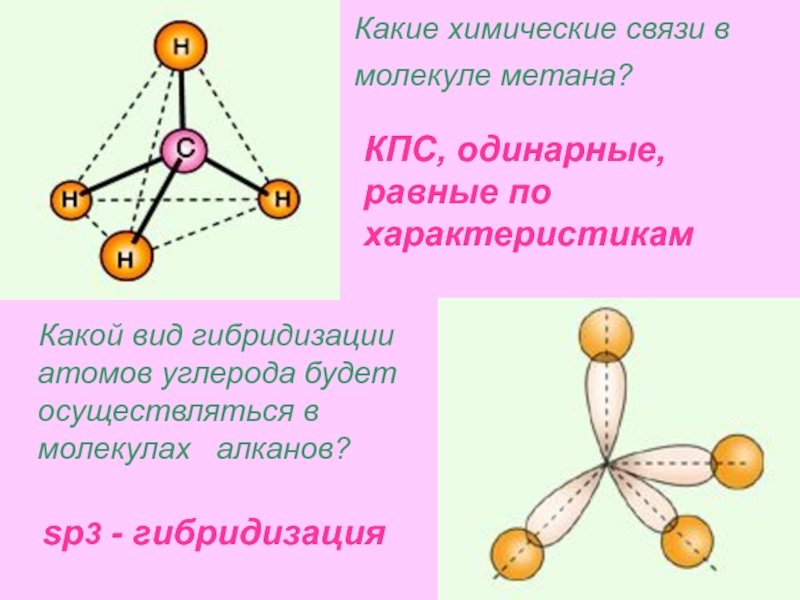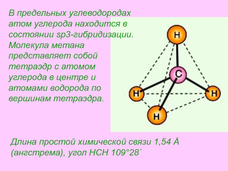 В предельных углеводородах атом углерода находится в состоянии sp3-гибридизации. Молекула метана представляет собой тетраэдр с атомом углерода в центре и атомами водорода по вершинам тетраэдра.