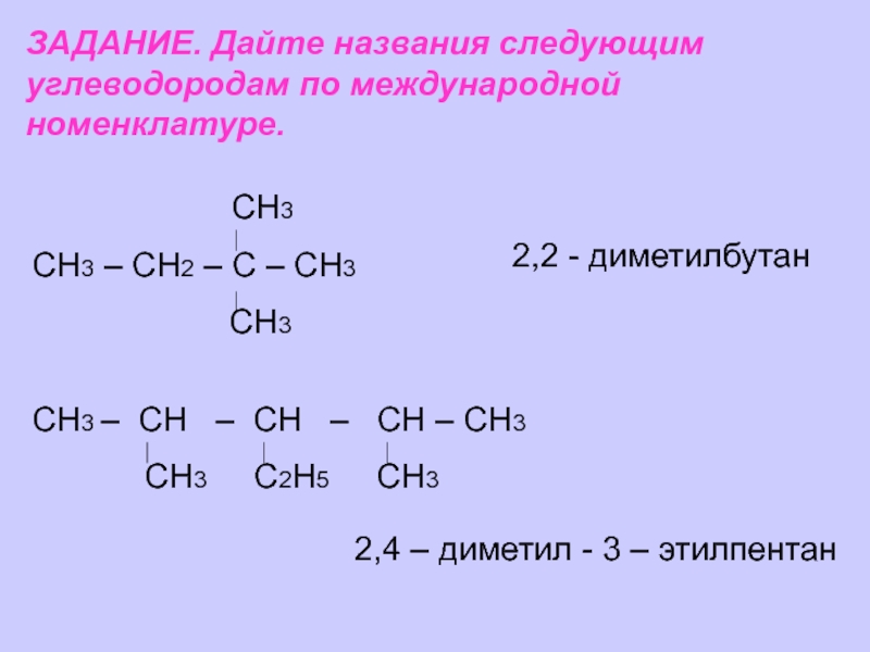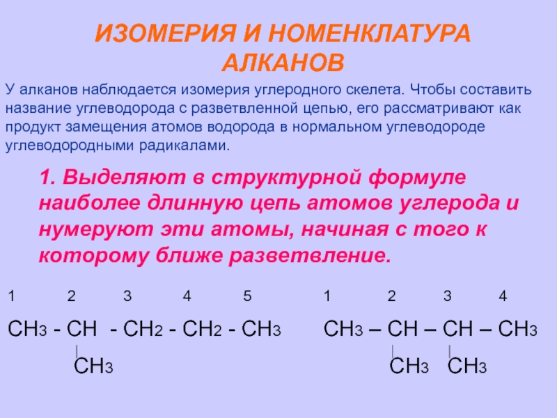 1. Выделяют в структурной формуле наиболее длинную цепь атомов углерода и нумеруют эти атомы, начиная с того к которому ближе разветвление.