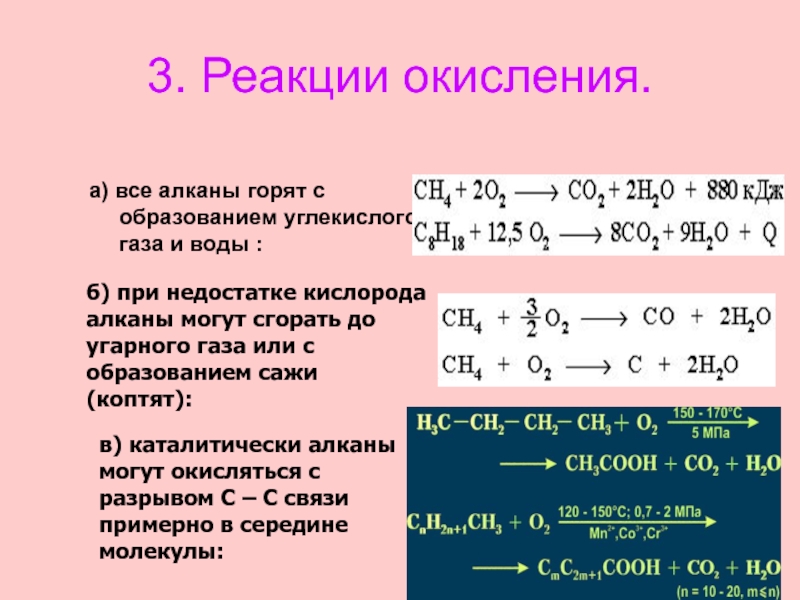 б) при недостатке кислорода алканы могут сгорать до угарного газа или с образованием сажи (коптят):