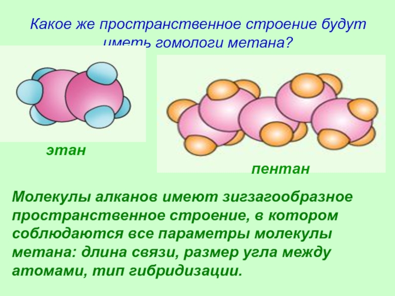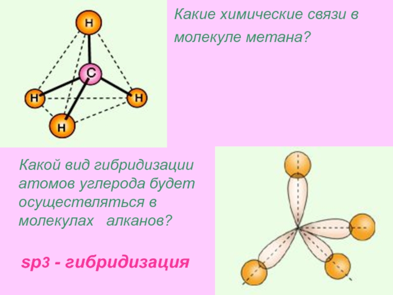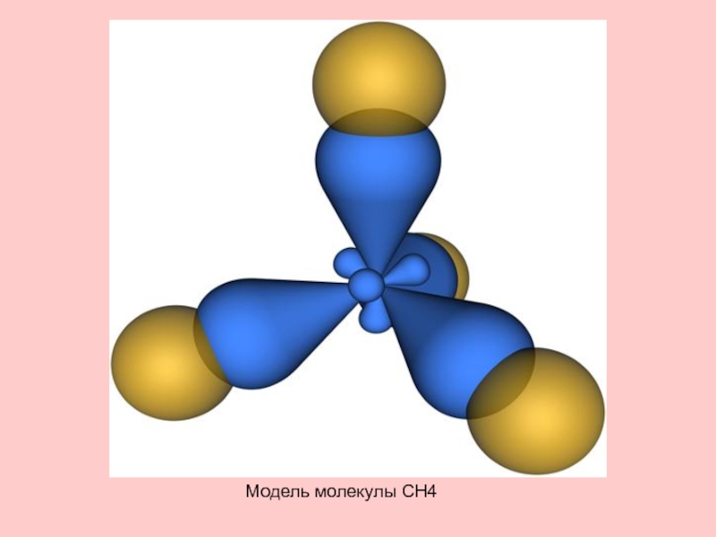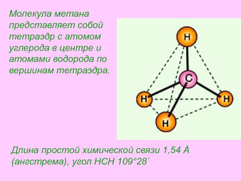 Молекула метана представляет собой тетраэдр с атомом углерода в центре и атомами водорода по вершинам тетраэдра.