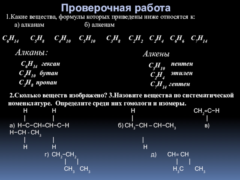 2.Сколько веществ изображено? 3.Назовите вещества по систематической номенклатуре. Определите среди них гомологи и изомеры.