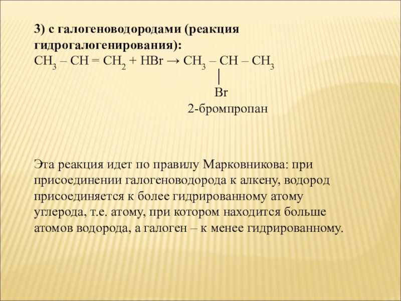 Эта реакция идет по правилу Марковникова: при присоединении галогеноводорода к алкену, водород присоединяется к более гидрированному атому углерода, т.е. атому, при котором находится больше атомов водорода, а галоген – к менее гидрированному.