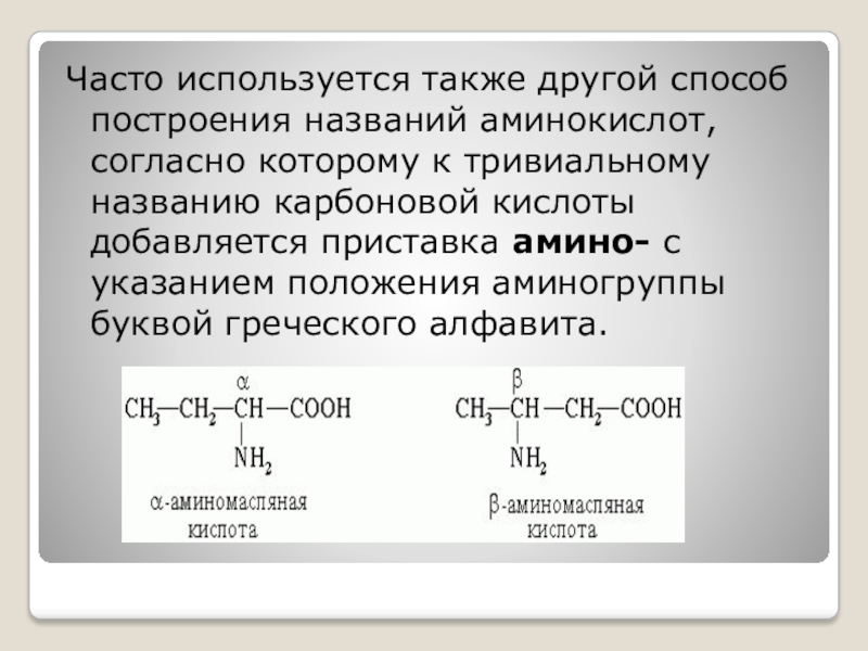 Слайд 4Часто используется также другой способ построения названий аминокислот, согласно которому к