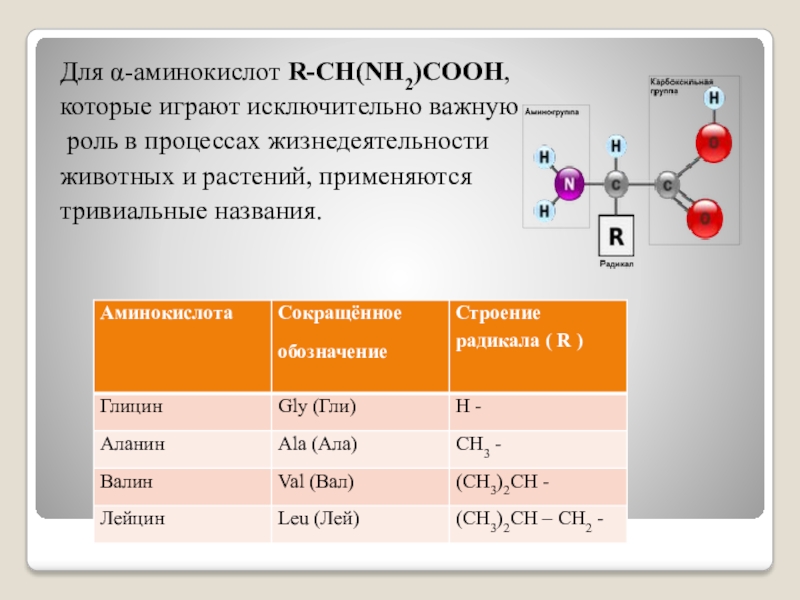 Для α-аминокислот R-CH(NH2)COOH, которые играют исключительно важную роль в процессах жизнедеятельности животных и растений, применяются тривиальные названия.